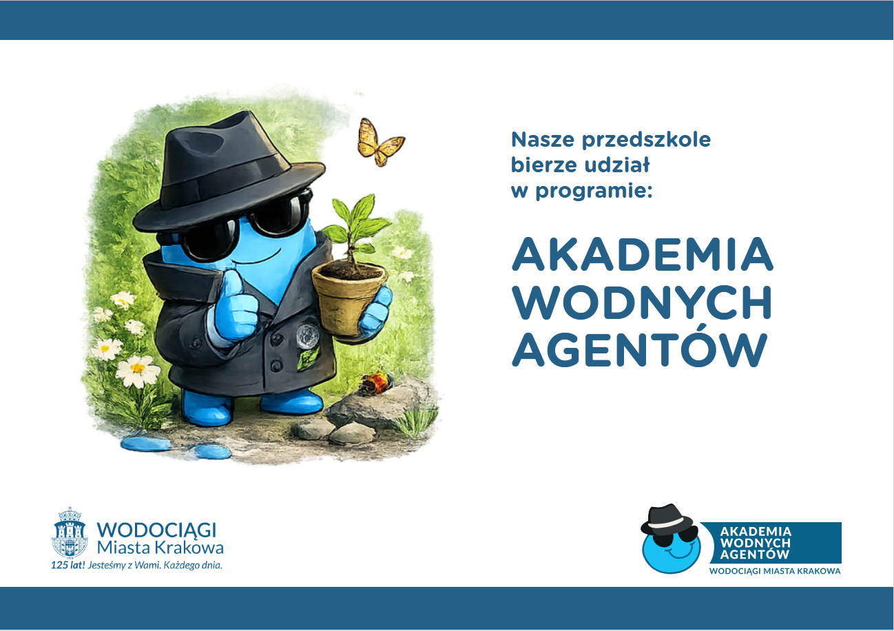 Nasze przedszkole bierze udział w Akademii Wodnych Agentów. Jej celem jest edukacja dzieci w zakrresie rozsądnego użycia i oszczędzania wody, poprzez udział w ciekawych zajęciach i przeprowadzanie wciągających eksperymentów.